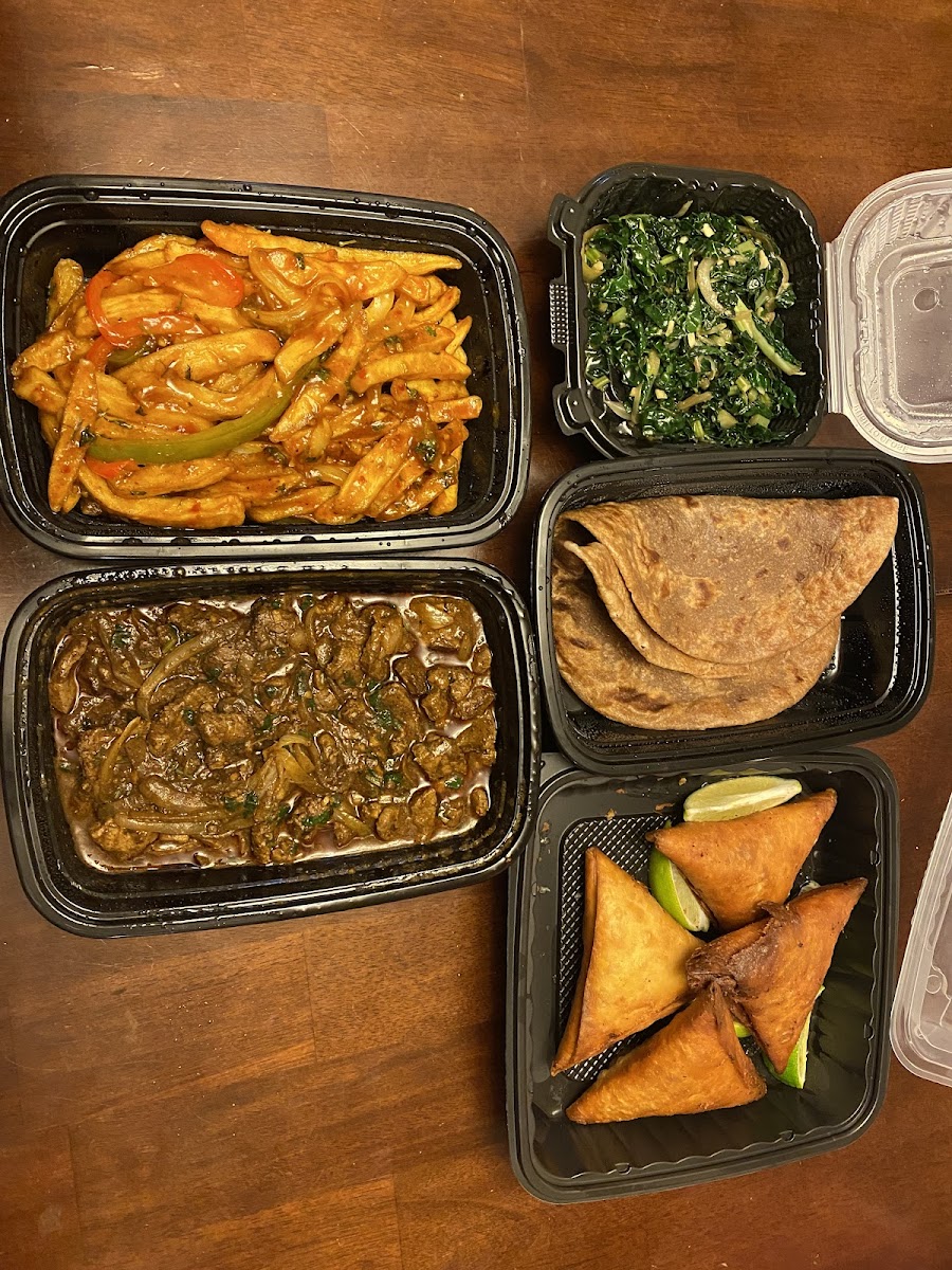 We ordered two goat curry , one chicken stew, two beef samosas, with collards, cabbage and bread. Cost $85 and was enough to split evenly for four adults, would highly recommended!